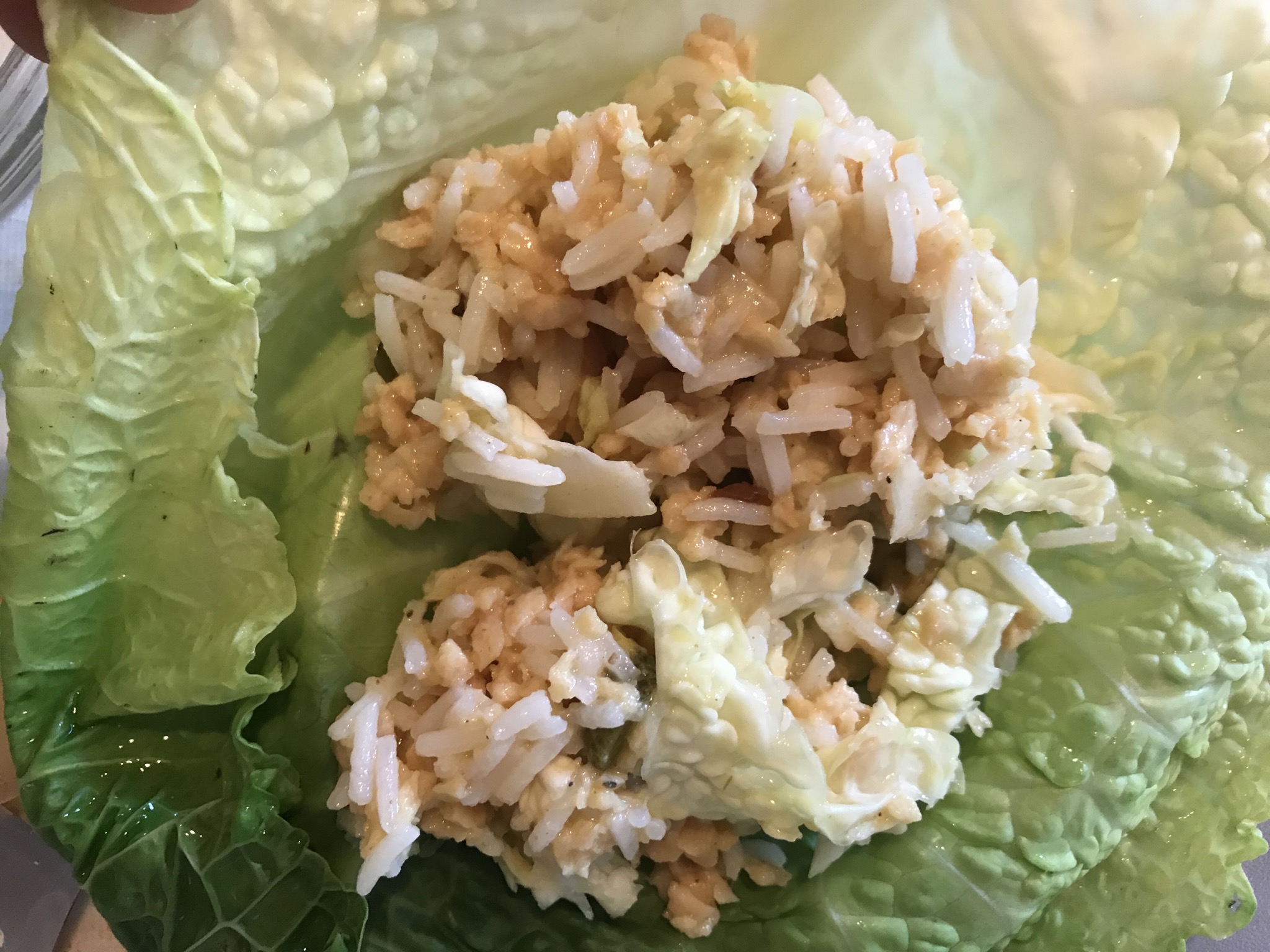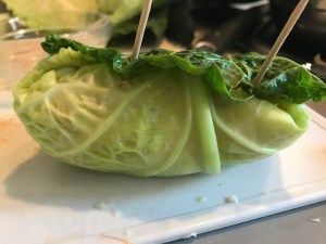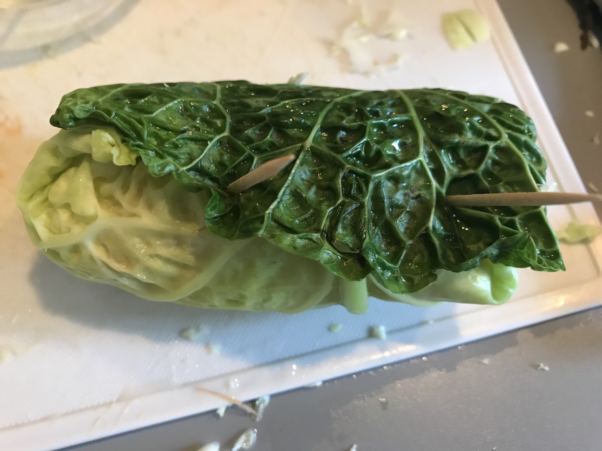 5. Metemos 2 cucharadas del relleno aprox en cada hoja de col y formamos un rollito. Los aseguramos con unos palillos.