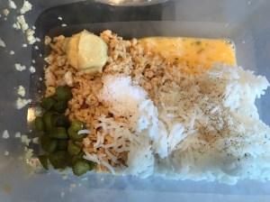 4. Batimos el huevo en un cuenco y agregamos la soja escurrida, una de las cucharaditas de mostaza, los pepinillos troceados (opcional), el arroz cocido y una pizca de sal y de pimienta. Mezclamos bien.