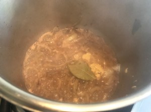 Incorporamos a la cazuela la maizena disuelta, la cucharadita de mostaza que faltaba, la miel, las hojas de laurel y un poco de sal y pimienta.