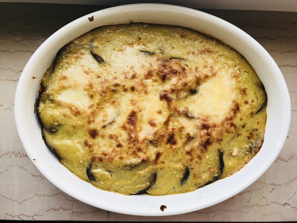 Comenzamos preparando las berenjenas en sí. Las lavamos y las cortamos en láminas de medio dedo de grosor (será mucho más fácil con una mandolina) a lo largo, como veis en la foto interior.