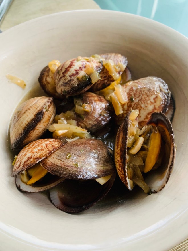 NOTA: la versión original lleva bacon, pero a mí no me pegaba mucho con las almejas y no se lo puse, pero si os apetece podéis echárselo una vez tostadito!