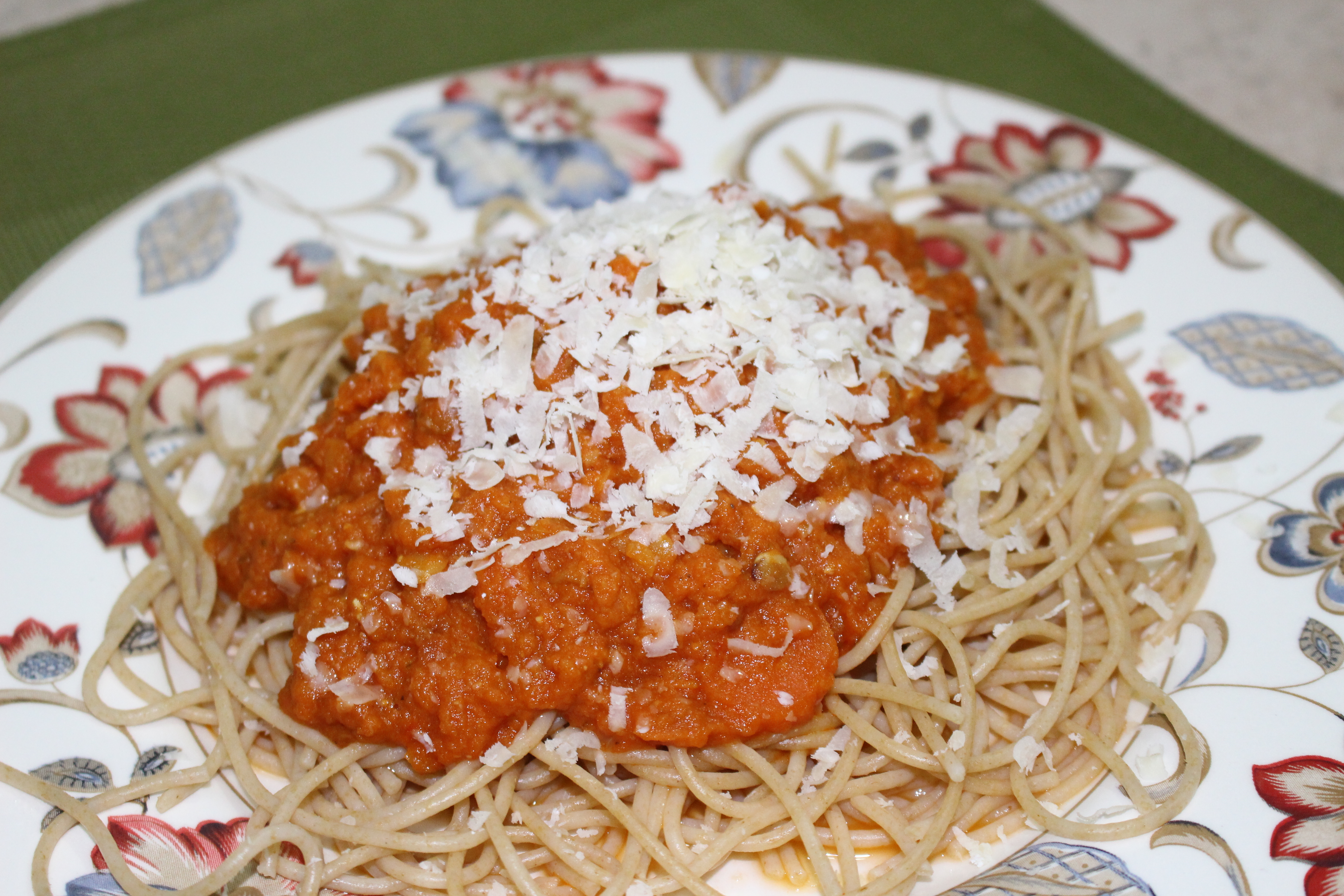 En cuanto al «descubrimiento» que os decía, se trata de la versión vegetariana de esta salsa. No tengo nada en contra de la carne, pero el otro día vi en el libro de Ella Woodward (Deliciously Ella) esta versión que sustituye la carne por lentejas y me decidí a probarla. Se la he dado a probar a mucha gente y NADIE ha notado la diferencia, todo el mundo ha dicho que estaba espectacular!!! Así que me lo he tomado como una opción alternativa, para incorporar legumbres de vez en cuando.
